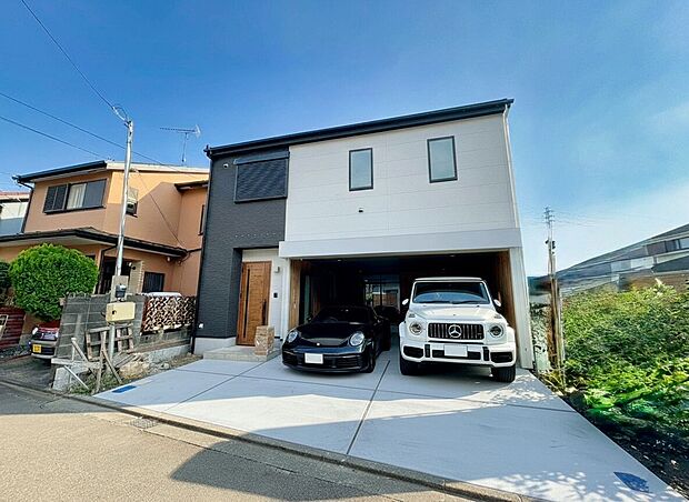 駐車スペース3台可(車種による) 18帖の電動シャッター付き車庫あり 無垢フローリング 広々としたルーフバルコニー付き 寝室にはウォークインクローゼット付き 都市ガス