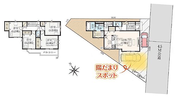 | 間取り | 4LDK 間取り内訳:洋室 6.5帖(2階)・洋室 5.2帖(2階)・洋室 5.2帖(2階)・洋室 5.2帖(2階)・リビングダイニングキッチン 17帖(1階) |