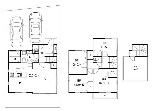 | 間取り | 4LDK 間取り内訳:リビングダイニングキッチン 20帖(1階)・洋室 6.8帖(2階)・洋室 6帖(2階)・洋室 6帖(2階)・洋室 5.5帖(2階) |