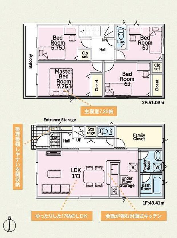 | 間取り | 4LDK 間取り内訳:リビングダイニングキッチン 17帖(1階)・洋室 7.2帖(2階)・洋室 6帖(2階)・洋室 5.7帖(2階)・洋室 5帖(2階) |