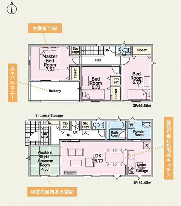 | 間取り | 4LDK 間取り内訳:リビングダイニングキッチン 15.7帖(1階)・和室 4.5畳(1階)・洋室 7.5帖(2階)・洋室 6.7帖(2階)・洋室 5.7帖(2階) |