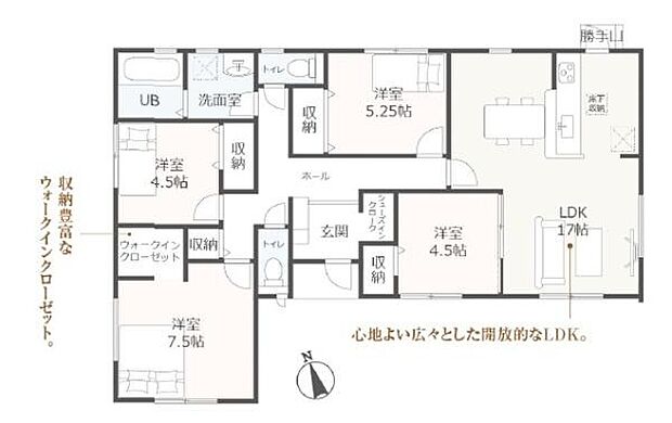 | 間取り | 4LDK 間取り内訳:リビングダイニングキッチン 17帖(1階)・洋室 7.5帖(1階)・洋室 5.2帖(1階)・洋室 4.5帖(1階)・洋室 4.5帖(1階) |