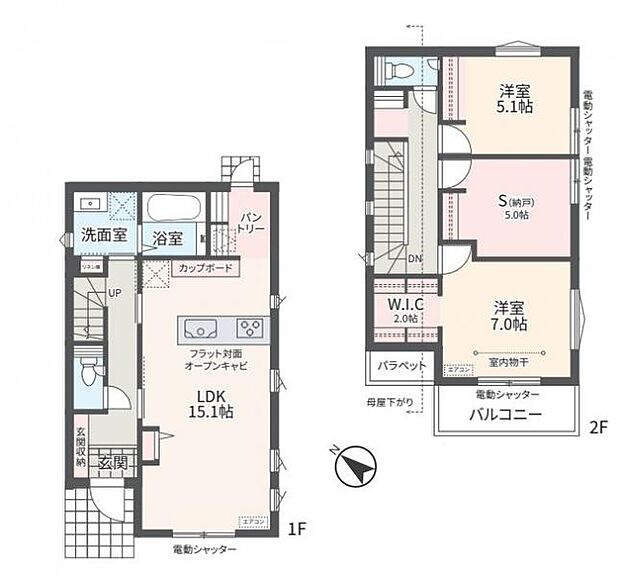 | 間取り | 2SLDK 間取り内訳:リビングダイニングキッチン 15.1帖(1階)・洋室 7帖(2階)・洋室 5.1帖(2階)・収納 5帖(2階) |