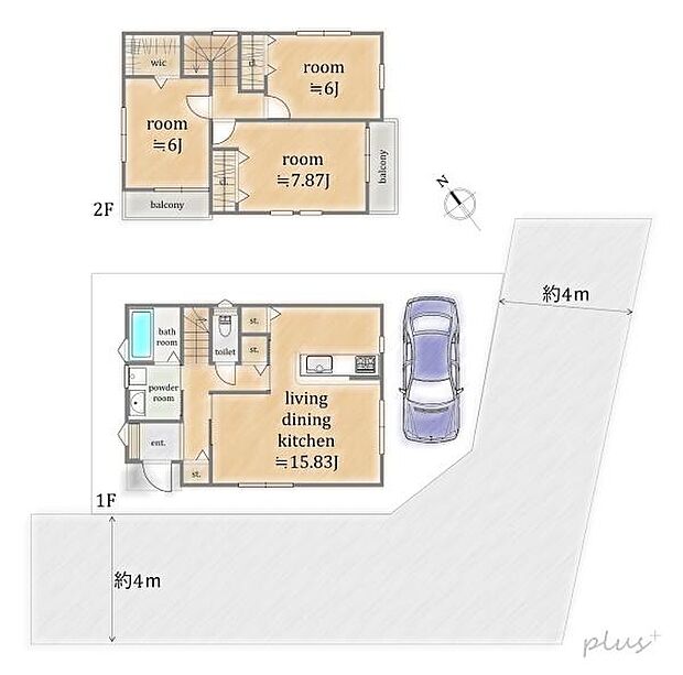 間取り内訳:リビングダイニングキッチン 15.8帖(1階)・洋室 7.8帖(2階)・洋室 6帖(2階)・洋室 6帖(2階)