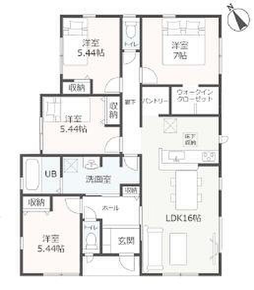 | 間取り | 4LDK(4LDK+ウォークインクローゼット) 間取り内訳:リビングダイニングキッチン 16帖(1階)・洋室 7帖(1階)・洋室 5.4帖(1階)・洋室 5.4帖(1階)・洋室 5.4帖(1階) |