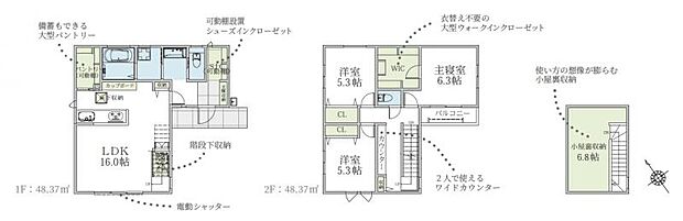 | 間取り | 3LDK 間取り内訳:リビングダイニングキッチン 16帖(1階)・洋室 6.3帖(2階)・洋室 5.3帖(2階)x2 |