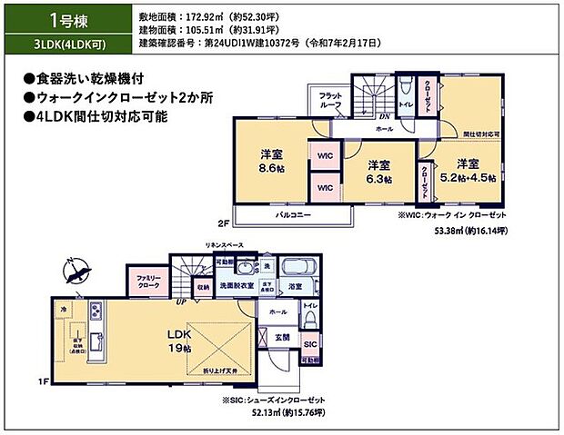 | 間取り | 3LDK 間取り内訳:リビングダイニングキッチン 19帖・洋室 8.6帖・洋室 6.3帖・洋室 9.7帖 |