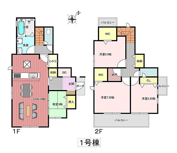 | 間取り | 3LDK 間取り内訳:リビングダイニングキッチン 16帖(1階)・和室 3畳(1階)・洋室 5.2帖(2階)・洋室 5.5帖(2階)・洋室 7.2帖(2階) |