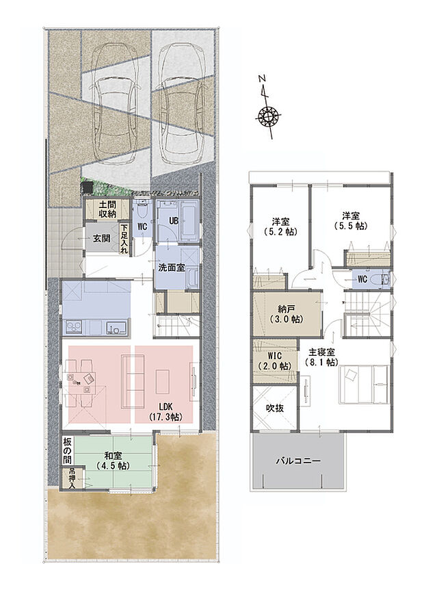 - 「建築条件付き土地」の「建物プラン例」は、土地購入者の設計プランの一例であり、プランの採用可否は任意です。
