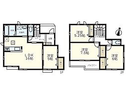| 間取り | 4LDK 間取り内訳:洋室 5帖(1階)・リビングダイニングキッチン 16帖(1階)・洋室 7.5帖(2階)・洋室 6帖(2階)・洋室 5.2帖(2階) |