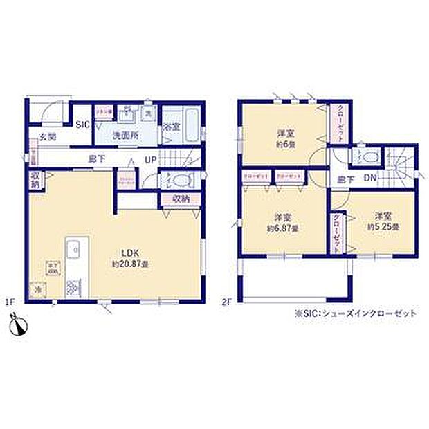 | 間取り | 3LDK 間取り内訳:リビングダイニングキッチン 20.8帖(1階)・洋室 6.8帖(2階)・洋室 6帖(2階)・洋室 5.2帖(2階) |