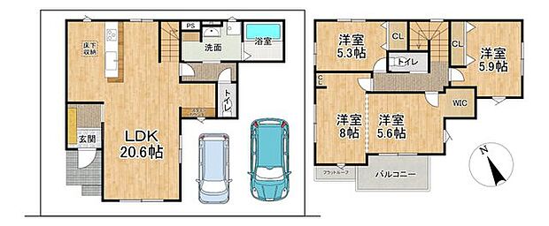 間取り内訳:リビングダイニングキッチン 20.6帖(1階)・洋室 5.3帖(2階)・洋室 8帖(2階)・洋室 5.6帖(2階)・洋室 5.9帖(2階)