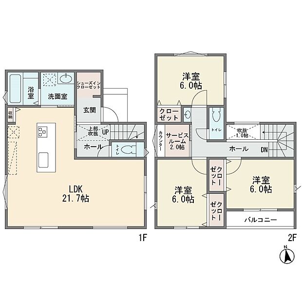 • 新築分譲2階建て全4棟です カースペース2台 LDK21.7帖 アイランドキッチン ルーフバルコニー シューズインクロゼット 3LDK+サービスルーム2帖 宅配ボックス 衣料乾燥機付き