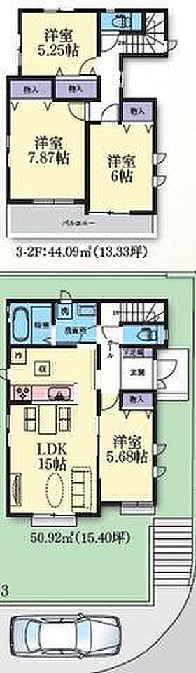 | 間取り | 4LDK 間取り内訳:洋室 5.6帖(1階)・リビングダイニングキッチン 15帖(1階)・洋室 7.8帖(2階)・洋室 6帖(2階)・洋室 5.2帖(2階) |