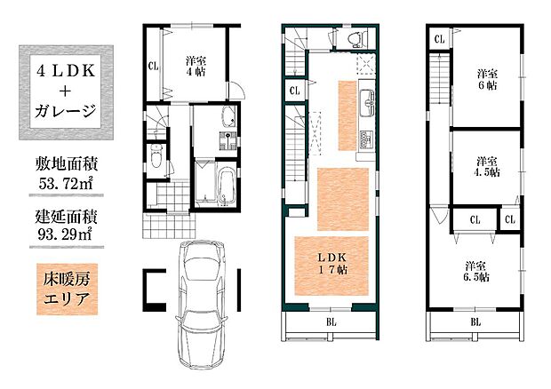 間取り 4LDK+ガレージ 建物階 木造3階建
