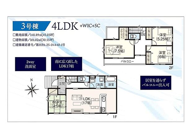 | 間取り | 4LDK 間取り内訳:洋室 7.5帖・洋室 6帖・洋室 5.2帖・リビングダイニングキッチン 17帖・和室 4.5畳 |