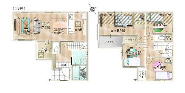 | 間取り | 4LDK 間取り内訳:リビングダイニングキッチン 17.4帖(1階)・洋室 9.5帖(2階)・洋室 4.8帖(2階)・洋室 4.4帖(2階)・洋室 4.8帖(2階) |