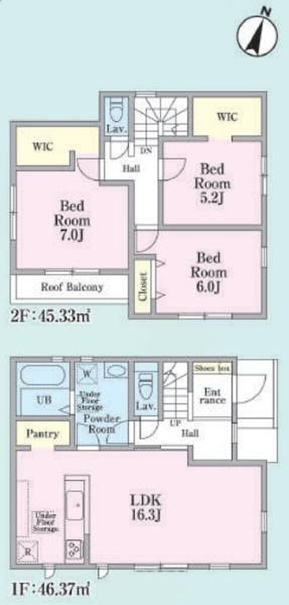 | 間取り | 3LDK 間取り内訳:リビングダイニングキッチン 16.3帖(1階)・洋室 7帖(2階)・洋室 6帖(2階)・洋室 5.2帖(2階) |
