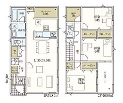 | 間取り | 3SLDK(+ウォークインクローク) 間取り内訳:リビングダイニングキッチン 19.7帖(1階)・洋室 8.3帖(2階)・洋室 5.8帖(2階)・洋室 5.5帖(2階)・その他 2.3帖(2階) |
