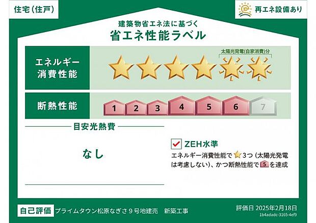 - 星マークの数が多いほどエネルギー消費性能が高いことを示しています。再エネ設備のない住宅は★0~★4の5段階評価、再エネ設備がある住宅は★0~★6の7段階評価となります。