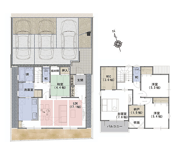 - 「建築条件付き土地」の「建物プラン例」は、土地購入者の設計プランの一例であり、プランの採用可否は任意です。