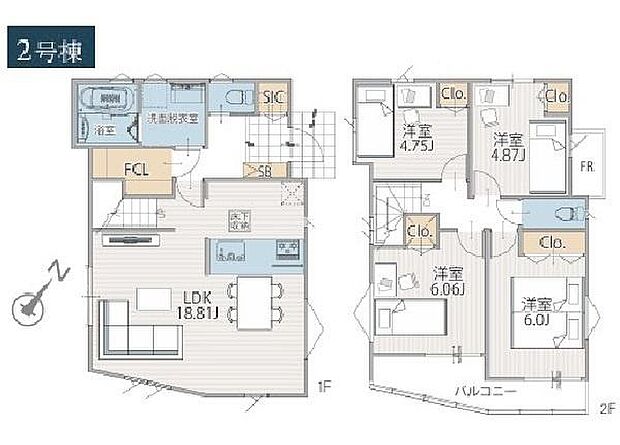 間取り内訳:リビングダイニングキッチン 18.8帖(1階)・洋室 6帖(2階)・洋室 6帖(2階)・洋室 4.8帖(2階)・洋室 4.7帖(2階)