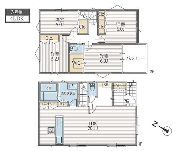 間取り内訳:リビングダイニングキッチン 20.1帖(1階)・洋室 6帖(2階)・洋室 6帖(2階)・洋室 5.2帖(2階)・洋室 5帖(2階)