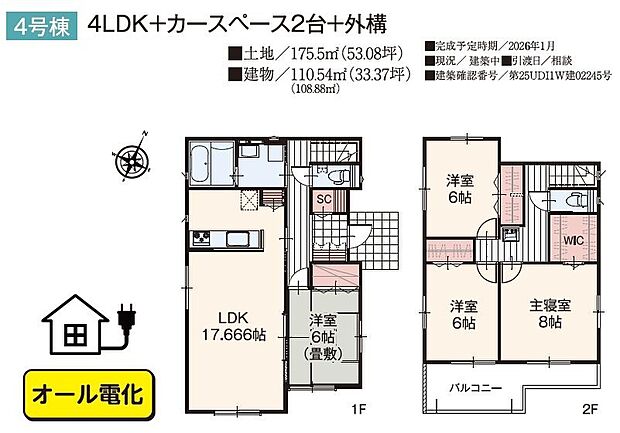 | 間取り | 4LDK 間取り内訳:リビングダイニングキッチン 17.6帖(1階)・和室 6畳(1階)・洋室 8帖(2階)・洋室 6帖(2階)x2 |