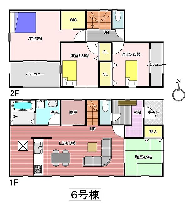 間取り内訳:リビングダイニングキッチン 18帖(1階)・和室 4.5畳(1階)・洋室 5.2帖(2階)・洋室 5.2帖(2階)・洋室 9帖(2階)