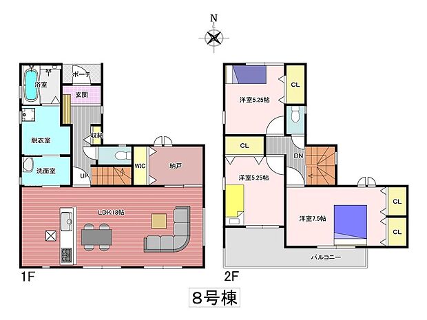 | 間取り | 3SLDK 間取り内訳:リビングダイニングキッチン 18帖(1階)・洋室 5.2帖(2階)・洋室 5.2帖(2階)・洋室 7.5帖(2階) |