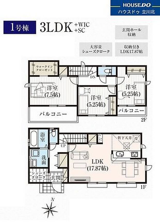 | 間取り | 3LDK 間取り内訳:リビングダイニングキッチン 17.8帖(1階)・洋室 7.5帖(2階)・洋室 5.2帖(2階)・洋室 5.2帖(2階) |
