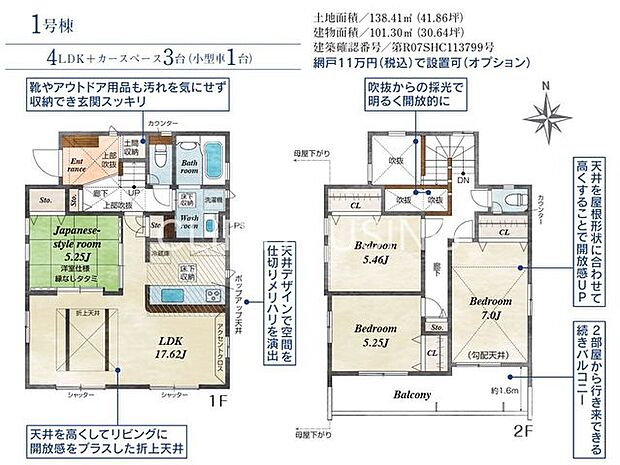 | 間取り | 4LDK 間取り内訳:リビングダイニングキッチン 17.6帖(1階)・和室 5.2畳(1階)・洋室 7帖(2階)・洋室 5.4帖(2階)・洋室 5.2帖(2階) |