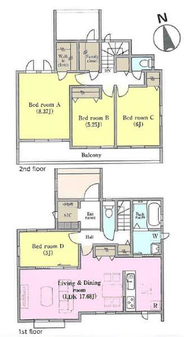 | 間取り | 4LDK 間取り内訳:リビングダイニングキッチン 17.6帖(1階)・洋室 5帖(1階)・洋室 5.2帖(2階)・洋室 6帖(2階)・洋室 8.3帖(2階) |
