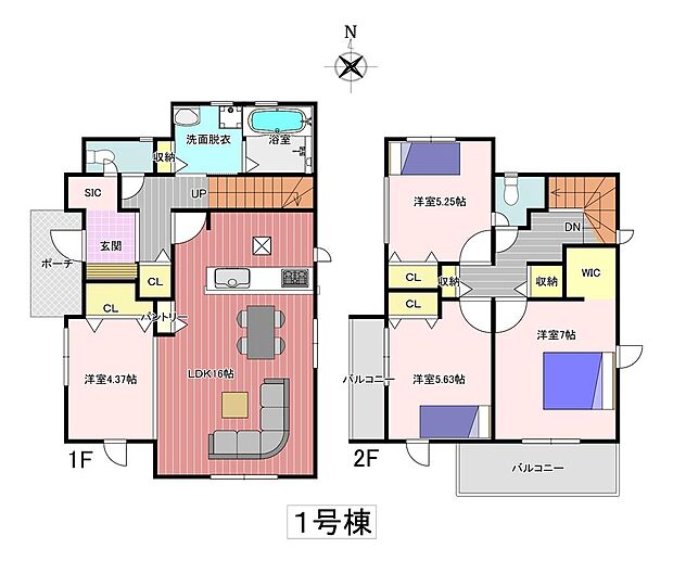 | 間取り | 4LDK 間取り内訳:リビングダイニングキッチン 16帖(1階)・和室 4.3畳(1階)・洋室 5.2帖(2階)・洋室 5.6帖(2階)・洋室 7帖(2階) |