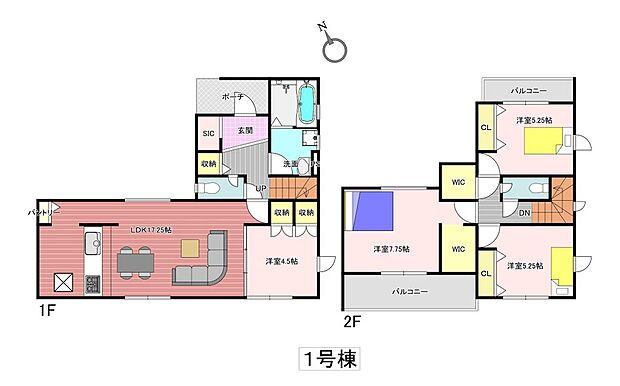 | 間取り | 4LDK 間取り内訳:リビングダイニングキッチン 17.2帖(1階)・洋室 4.5帖(1階)・洋室 5.2帖(2階)・洋室 5.2帖(2階)・洋室 7.7帖(2階) |