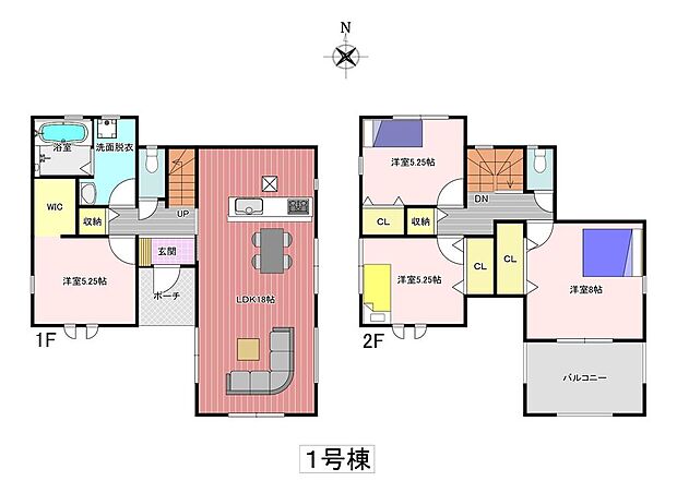 間取り内訳:リビングダイニングキッチン 18帖(1階)・洋室 5.2帖(1階)・洋室 5.2帖(2階)・洋室 5.2帖(2階)・洋室 8帖(2階)