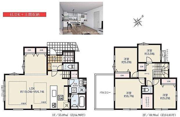 | 間取り | 4LDK(5LDKに間仕切り対応可能) 間取り内訳:洋室 5.2帖・洋室 3.5帖・リビングダイニングキッチン 23.1帖・洋室 8.7帖・洋室 5.2帖 |