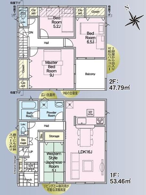 | 間取り | 4LDK 間取り内訳:リビングダイニングキッチン 16帖(1階)・和室 5畳(1階)・洋室 9帖(2階)・洋室 6.5帖(2階)・洋室 5.2帖(2階) |