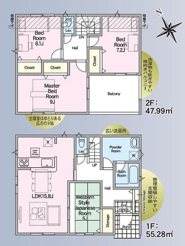 | 間取り | 4LDK 間取り内訳:リビングダイニングキッチン 15.8帖(1階)・和室 5畳(1階)・洋室 9帖(2階)・洋室 7.2帖(2階)・洋室 6.1帖(2階) |
