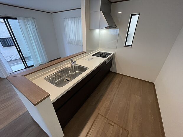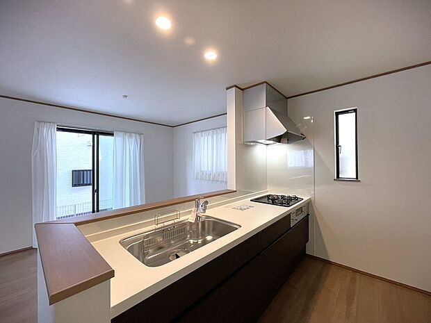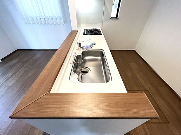 • 料理をしながらでも家族の笑顔が見える対面キッチン。リビングからの陽光が手元まで届き、明るい空間で楽しく家事ができます。「今日の出来事」を話しながら、家族とのコミュニケーションが自然と深まる住まいです。