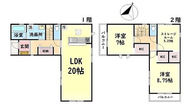 | 間取り | 2LDK 間取り内訳:リビングダイニングキッチン 20帖(1階)・洋室 8.7帖(2階)・洋室 7帖(2階)・収納 5.2帖(2階) |