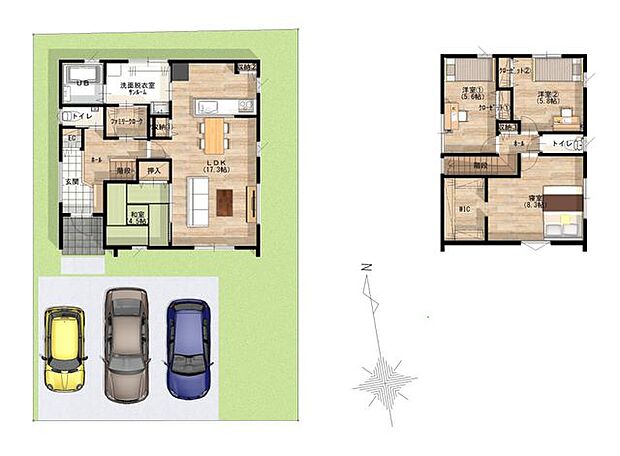 | 間取り | 4LDK 間取り内訳:リビングダイニングキッチン 17.3帖(1階)・和室 4.5畳(1階)・洋室 5.6帖(2階)・洋室 5.8帖(2階)・洋室 8.3帖(2階) |