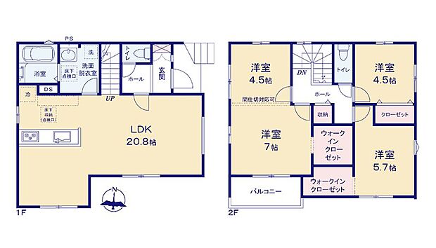 間取り内訳:洋室 11.5帖(2階)・洋室 5.7帖(2階)・洋室 4.5帖(2階)・リビングダイニングキッチン 20.8帖(1階)