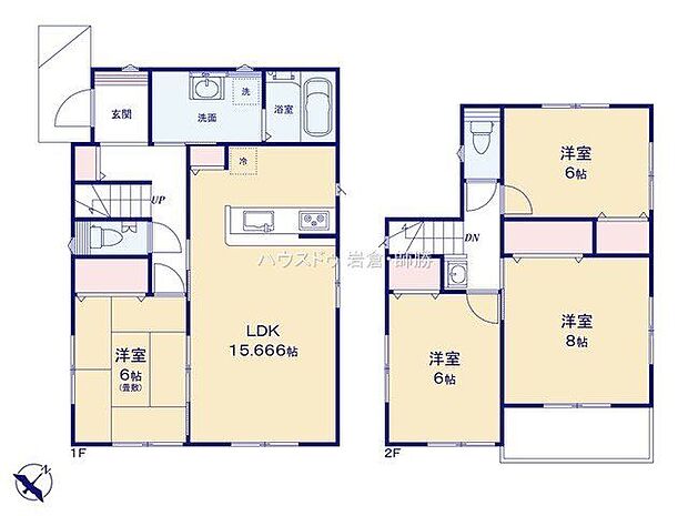 | 間取り | 4LDK 間取り内訳:リビングダイニングキッチン 15.6帖(1階)・洋室 6帖(1階)・洋室 8帖(2階)・洋室 6帖(2階)・洋室 6帖(2階) |