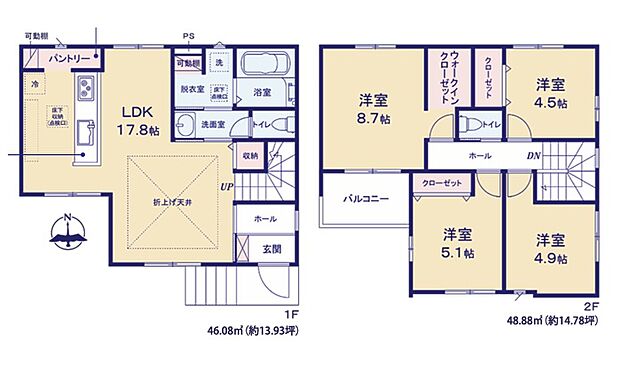 | 間取り | 4LDK 間取り内訳:リビングダイニングキッチン 17.8帖(1階)・洋室 8.7帖(2階)・洋室 5.1帖(2階)・洋室 4.9帖(2階)・洋室 4.5帖(2階) |