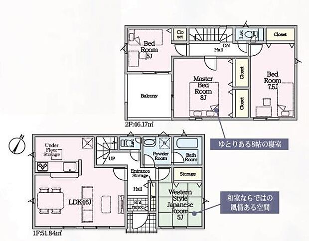 | 間取り | 4LDK 間取り内訳:リビングダイニングキッチン 16帖(1階)・和室 5畳(1階)・洋室 8帖(2階)・洋室 7.5帖(2階)・洋室 5帖(2階) |