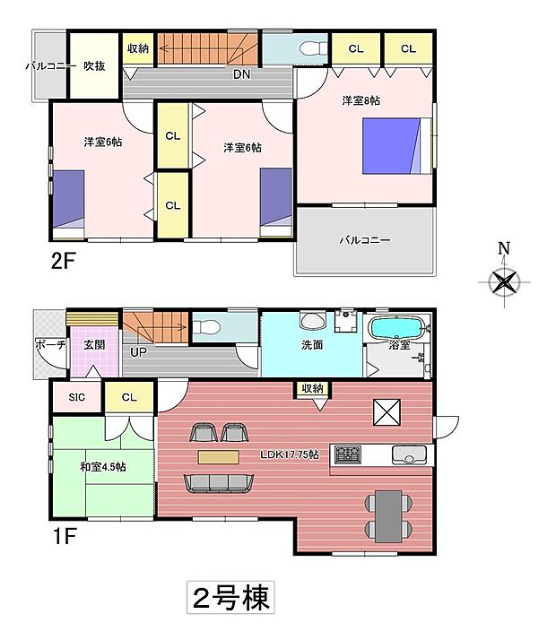 | 間取り | 4LDK 間取り内訳:リビングダイニングキッチン 17.8帖(1階)・和室 4.5畳(1階)・洋室 6帖(2階)・洋室 6帖(2階)・洋室 8帖(2階) |