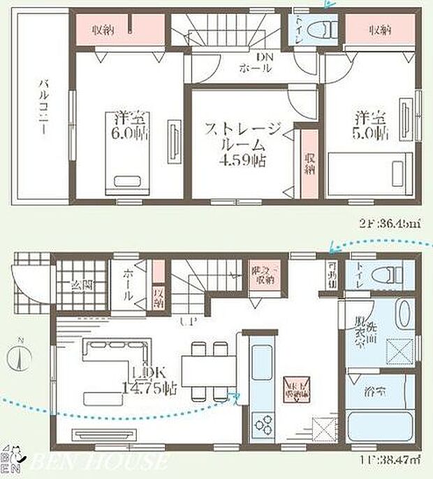| 間取り | 2SLDK 間取り内訳:リビングダイニングキッチン 14.7帖(1階)・洋室 6帖(2階)・洋室 5帖(2階)・収納 4.5帖(2階) |