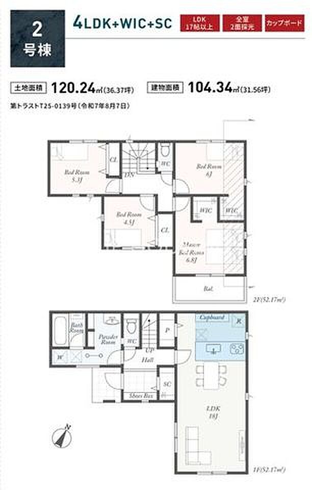 | 間取り | 4LDK 間取り内訳:リビングダイニングキッチン 18帖(1階)・洋室 6.8帖(2階)・洋室 6帖(2階)・洋室 5.3帖(2階)・洋室 4.5帖(2階) |