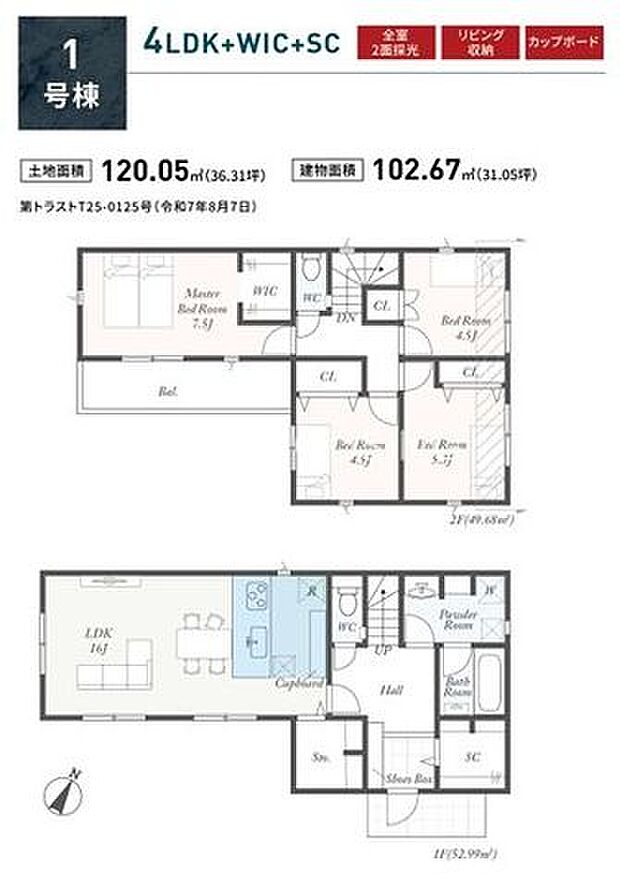 間取り内訳:リビングダイニングキッチン 16帖(1階)・洋室 7.5帖(2階)・洋室 5.3帖(2階)・洋室 4.5帖(2階)・洋室 4.5帖(2階)